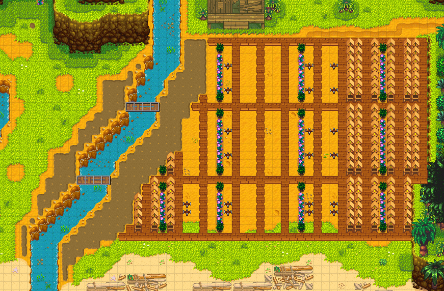 This image shows all irrigated tiles (useful for all playthroughs) and a convenient layout for Honey production (if you don't feel like doing crops here). It produces 259,080g every 4 days, or 362,712 with Artisan — the GPD equivalent of Botanist + 24 pigs but for far less effort. It's most attractive if you put flooring under all the Bee Houses; I just left open areas in this picture for clarity of layout. The Tea Bushes can be replaced with more Bee Houses, but I like this look and Tea Leaves can be useful.